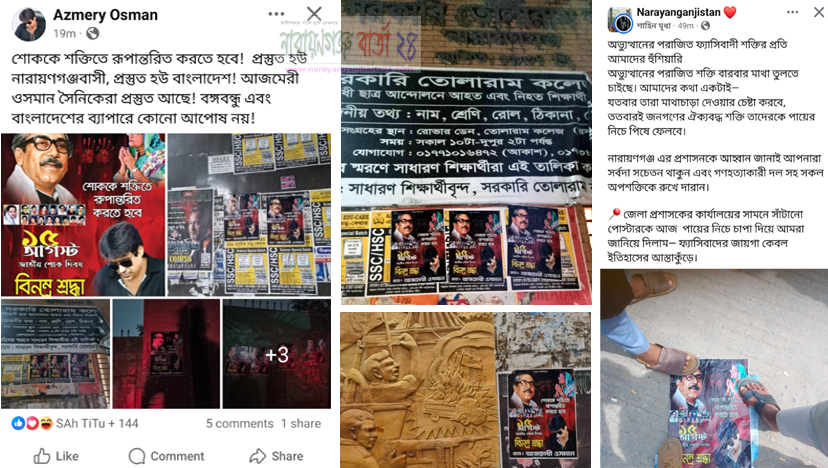 রবিবার ১০ আগস্ট নারায়ণগঞ্জিস্থান গ্রপে দুপুর ৩টা ৬ মিনিটে একজন ইউজার জেলা প্রশাসনের মূল ফটক থেকে এসব পোস্টার ছিড়ে ছবি পোস্ট করে প্রতিবাদ জানাতে দেখা গেছে। যা ফেসবুকে পোস্ট করে ওই ইউজার লিখেছেন, ‘অভ্যুত্থানের পরাজিত ফ্যাসিবাদী শক্তির প্রতি আমাদের হুঁশিয়ারি অভ্যুত্থানের পরাজিত শক্তি বারবার মাথা তুলতে চাইছে। আমাদের কথা একটাই-যতবার তারা মাথাচাড়া দেওয়ার চেষ্টা করবে, ততবারই জনগণের ঐক্যবদ্ধ শক্তি তাদেরকে পায়ের নিচে পিষে ফেলবে। নারায়ণগঞ্জ এর প্রশাসনকে আহ্বান জানাই আপনারা সর্বদা সচেতন থাকুন এবং গণহত্যাকারী দল সহ সকল অপশক্তিকে রুখে দারান। জেলা প্রশাসকের কার্যালয়ের সামনে সাঁটানো পোস্টারকে আজ পায়ের নিচে চাপা দিয়ে আমরা জানিয়ে দিলাম- ফ্যাসিবাদের জায়গা কেবল ইতিহাসের আস্তাকুঁড়ে।