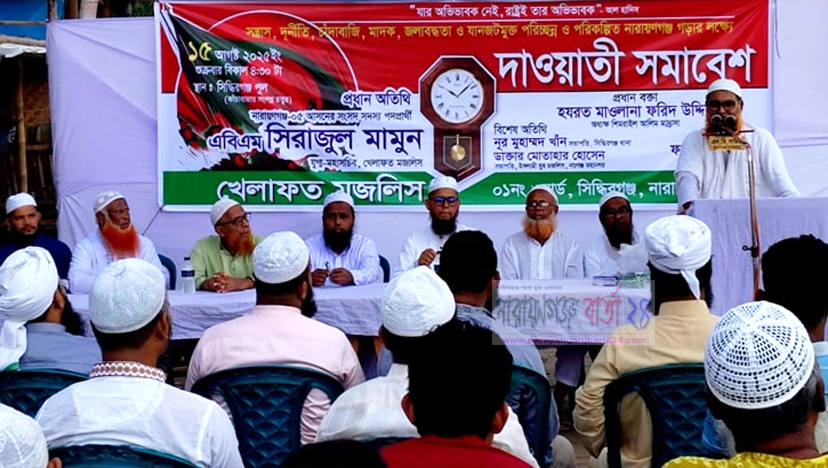 নারায়ণগঞ্জ বার্তা ২৪ : সন্ত্রাস, দুর্নীতি, চাঁদাবাজি, মাদক, জলাবদ্ধতা ও যানজটমুক্ত পরিচ্ছন্ন ও মানবিক নারায়ণগঞ্জ গড়ার অঙ্গীকারে সিদ্ধিরগঞ্জে খেলাফত মজলিসের নির্বাচনী প্রস্তুতি সমাবেশ অনুষ্ঠিত হয়েছে। শুক্রবার (১৫ আগস্ট) বিকালে সিদ্ধিরগঞ্জ পুলের কাঁচাবাজার সংলগ্ন চত্বরে নাসিকের ১নং ওয়ার্ড শাখার উদ্যোগে এ সমাবেশ হয়। সভাপতিত্ব করেন ওয়ার্ড সভাপতি ফজলুল হক মুকুল। সমাবেশে প্রধান অতিথি ছিলেন খেলাফত মজলিসের কেন্দ্রীয় যুগ্ম মহাসচিব ও নারায়ণগঞ্জ-৫ আসনে দেওয়াল ঘড়ি প্রতীকের এমপি প্রার্থী এবিএম সিরাজুল মামুন।